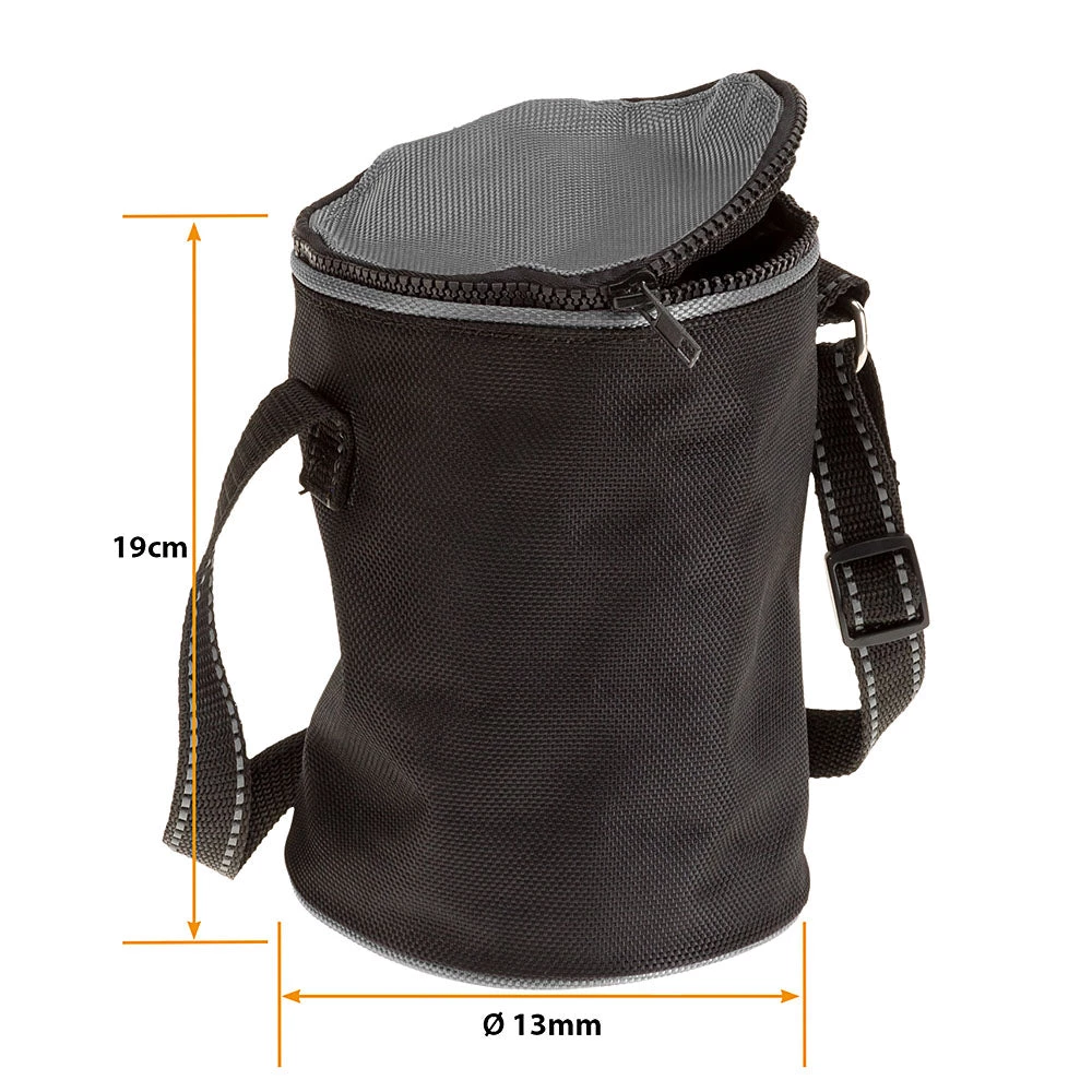Draußen unterwegs mit Fido? Hier kommt ein sehr nützliches Accessoire zum Mitnehmen! Treats Bag ist die ideale Lösung um die Belohnungsleckerlis für Deinen Hund immer griffbereit zu haben und die Versorgung damit zu gewährleisten. Diese Tasche aus Nylon, ein langlebiges und widerstandsfähiges Material, ist in 2 Größen erhältlich: Treats Bag, die kompakte mit 12 cm Durchmesser und 13 cm in der Höhe und Treats Bag Large mit einem Durchmesser von 13 cm und einer Höhe von 19 cm. Die Tasche ist mit einem Verschlusssystem ausgestattet, mit dem Sie Lebensmittel sicher und effektiv aufbewahren können: Das kleinere Modell hat eine Kordel mit Gummizug, die größere einen praktischen Reißverschluss.