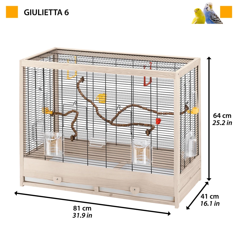 Giulietta 6 ist ein Vogelheim für Kanarienvögel oder kleine Exoten, in einem puristischen Design, das sich durch eine Struktur mit Säulen und Rahmen aus robustem Holz, FSC™ -zertifiziertem, auszeichnet, aus Wäldern, die nach strengen ökologischen, sozialen und wirtschaftlichen Standards verantwortungsbewusst bewirtschaftet werden und anderen kontrollierten Quellen. Das Holz wird durch einen ökologisch unbedenklichen und schimmelhemmenden Imprägnierlack geschützt und so UV-Strahlungsbeständig und wasserabweisend ist. Dieser Lack wird mittels Flow-Coating-Technologie aufgetragen und verlängert die Produkthaltbarkeit über einen großen Zeitraum.