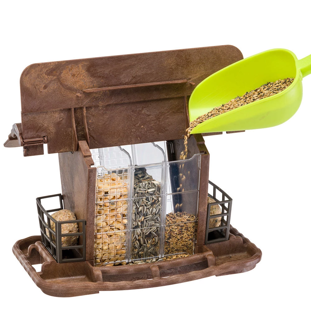 Jok sind innovative Produkte, mit denen Sie Wildvögel mit Nahrung und Futter versorgen können und die auch zu einem hervorragenden Unterschlupf werden können, wenn die mitgelieferten transparenten Elemente nicht montiert werden. Als Futtersilo verwendet, kann Jok durch die speziellen Trennwände je nach gewähltem Modell mit einer, zwei oder drei verschiedenen Samen- oder Erdnusssorten gefüllt werden: Auf diese Weise stellen Sie die notwendige Nahrung für Wildvögel sicher, insbesondere während der Fütterung kältere Monate. Jok 2 hat zum Beispiel auch spezielle Fächer, um sauberes und frisches Wasser oder Fettbällchen zu liefern, die in die Seitengitter gesteckt werden können. Darüber hinaus sind die transparenten Paneele sehr nützlich, da sie es Ihnen ermöglichen, den Füllstand des verfügbaren Futters schnell zu überprüfen.