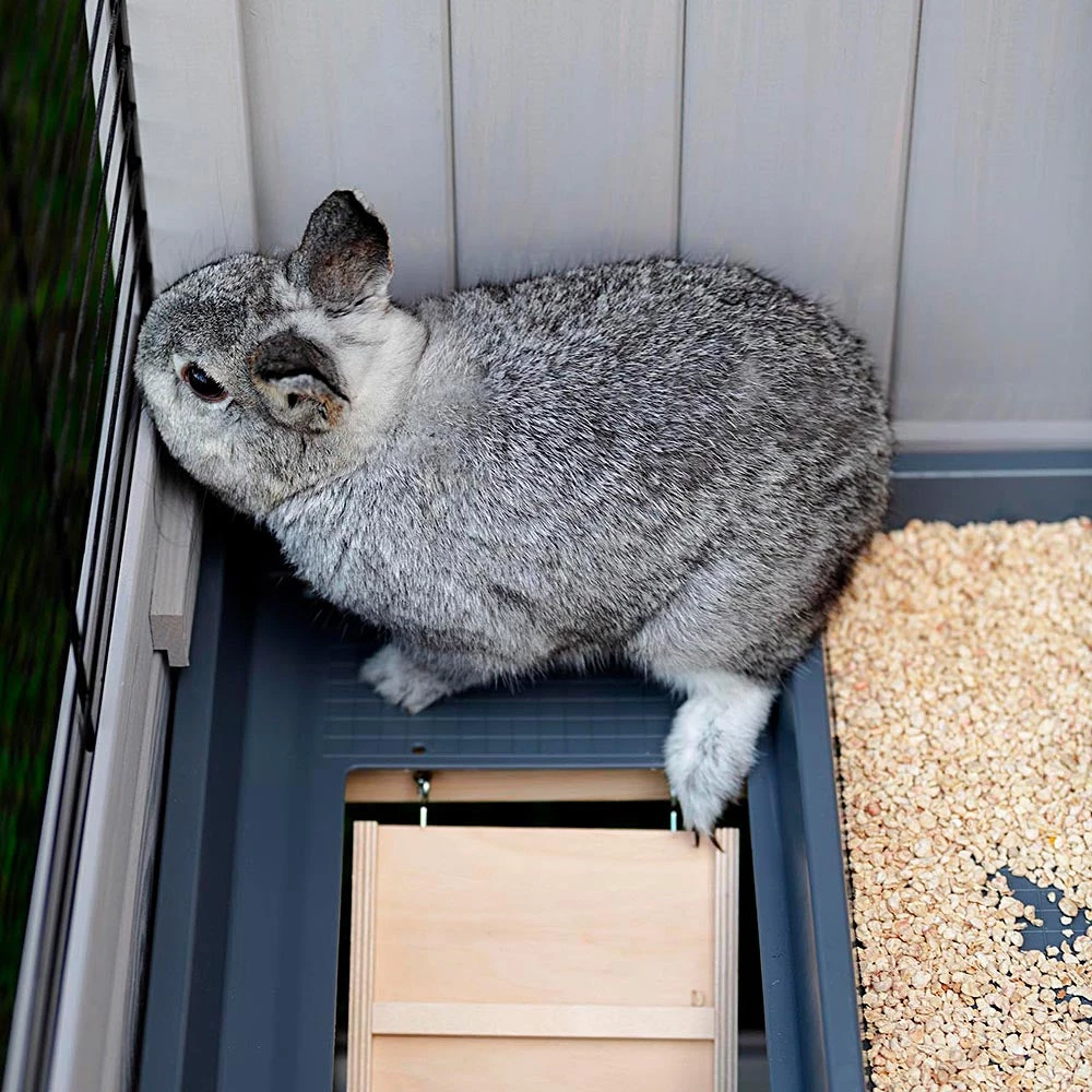 Ferplast hat hier für Ihren pelzigen Freund eine Residenz geschaffen, die an Komfort keine Wünsche offen lässt. Unterteilt in zwei Ebenen hat der kleine Nager hier genug Platz für alle seine Aktivitäten: die untere Etage zum Fressen, Trinken, oder für die Tagesaktivitäten, die obere Etage dient sozusagen als Ruhezone, die über eine Holztreppe erreichbar ist. Unten finden Sie ein Gehege mit Metallzaun und einer Schiebetür mit Sicherheitsverriegelungshaken, und eine Holzleiter für den Zugang zum Obergeschoss, das sich beispielsweise für die Nachtaktivitäten oder Ruhezeiten während des Tages eignet. In dieser Ruhezone gibt es ein komfortables Kaninchenhäuschen und der Boden ist in zwei Plastikschubladen unterteilt, die die Spreu zuverlässig zurückhalten.
