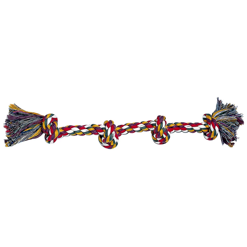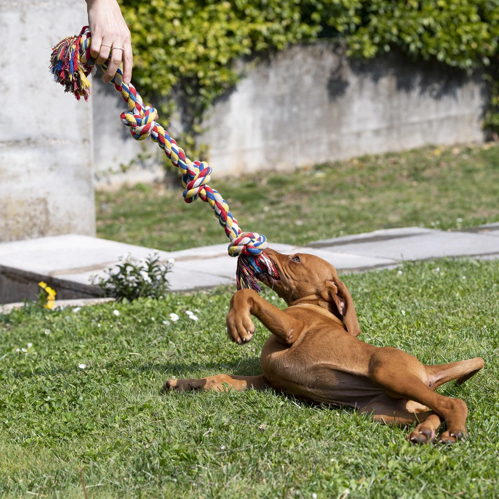Spieltau aus Baumwolle mit zwei Knoten in der Mitte und an den Enden für wilde Zerrspiele mit Ihrem Hund. Baumwollspielzeuge wie dieses sind eine gute Alternative zu den herkömmlichen Hundespielzeugen aus Gummi oder Latex.