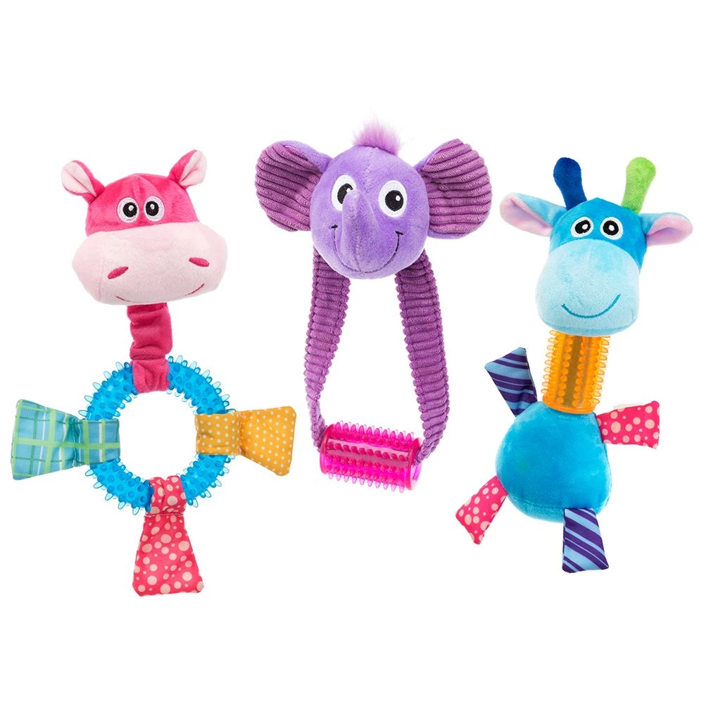 Diese Hundespielzeuge haben niedliche kleine Tierformen und sind ideal, um mit Ihrem Freund Tauziehen oder Fangen zu spielen. Die Elemente mit unregelmäßiger Oberfläche sind nützlich, um einen angenehmen Massageeffekt auf das Zahnfleisch Ihres Haustieres auszuüben. Sie sind aus Polyester und strapazierfähigem thermoplastischem Gummi gefertigt.