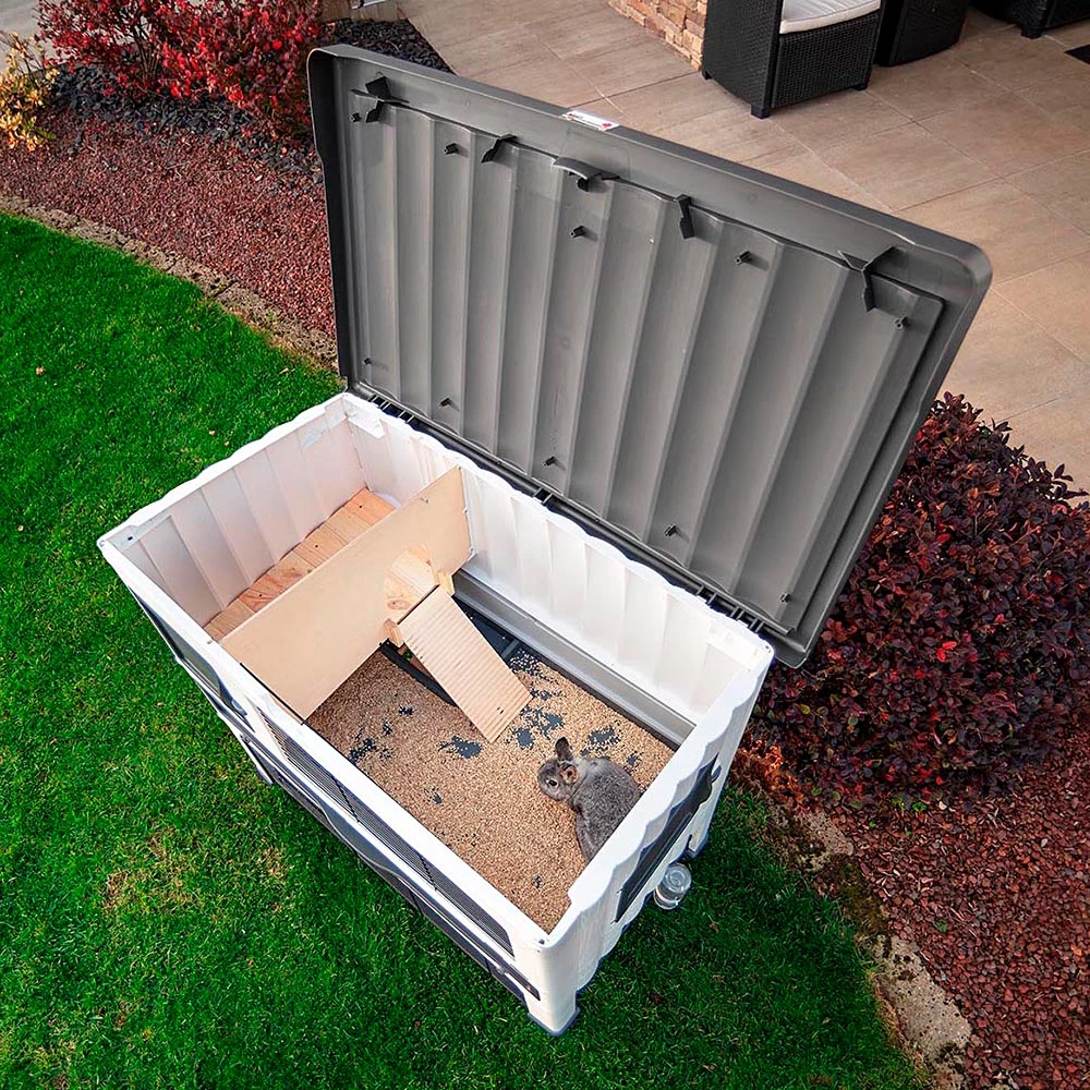 Alle Kunststoffheime Grand Lodge verfügen über diegleichen innovativen, technischen Kennzeichen, die sie so sicher und komfortabel machen: im Inneren ein Hasenhaus mit Holzwänden und Eingangstür, eine nützlichen Seitentür und ein effizientes Verschlusssystem. Bei der Wartung/Reinigung hilft ein vollständig zu öffnendes Dach und die praktische Schmutzfangschale zum Ausziehen.