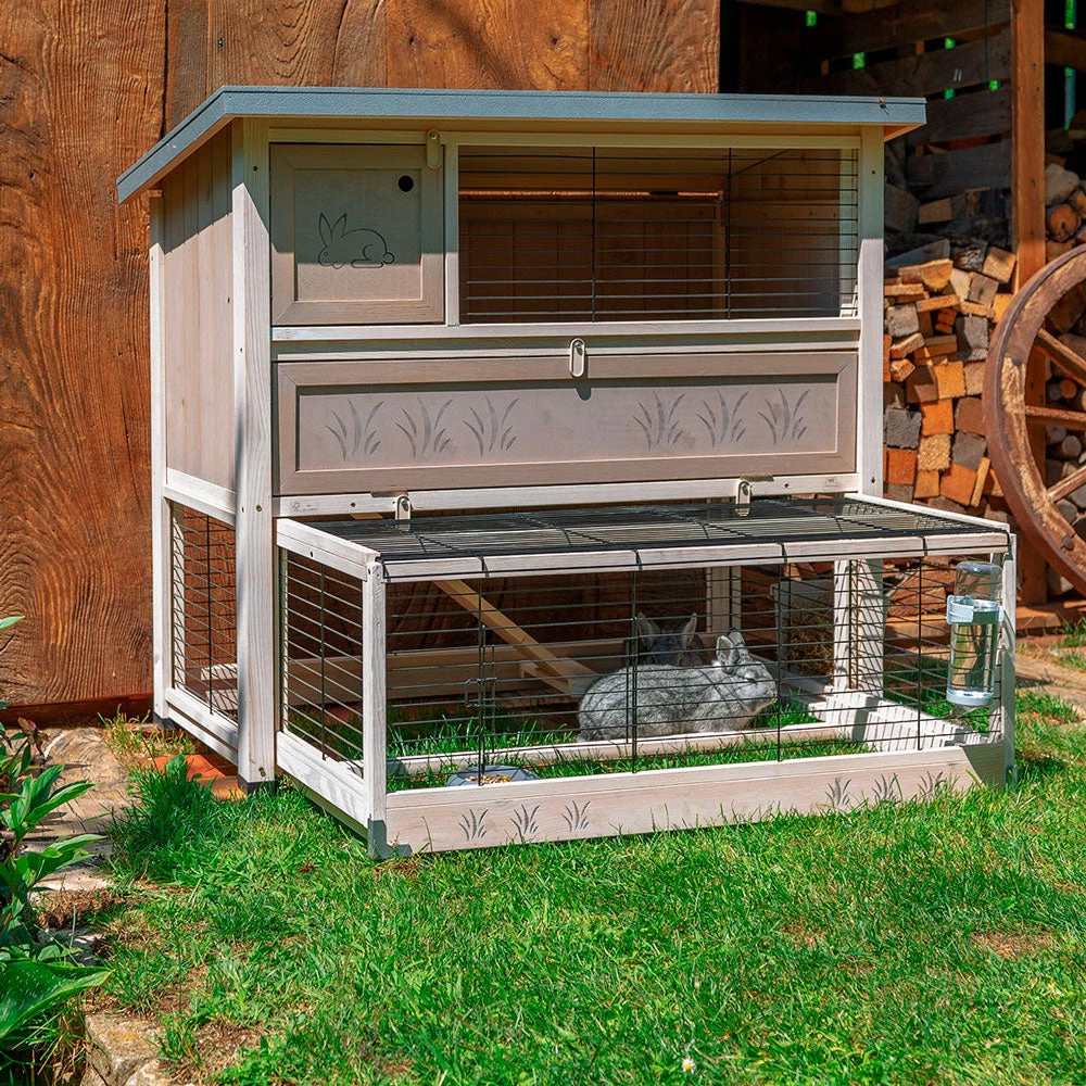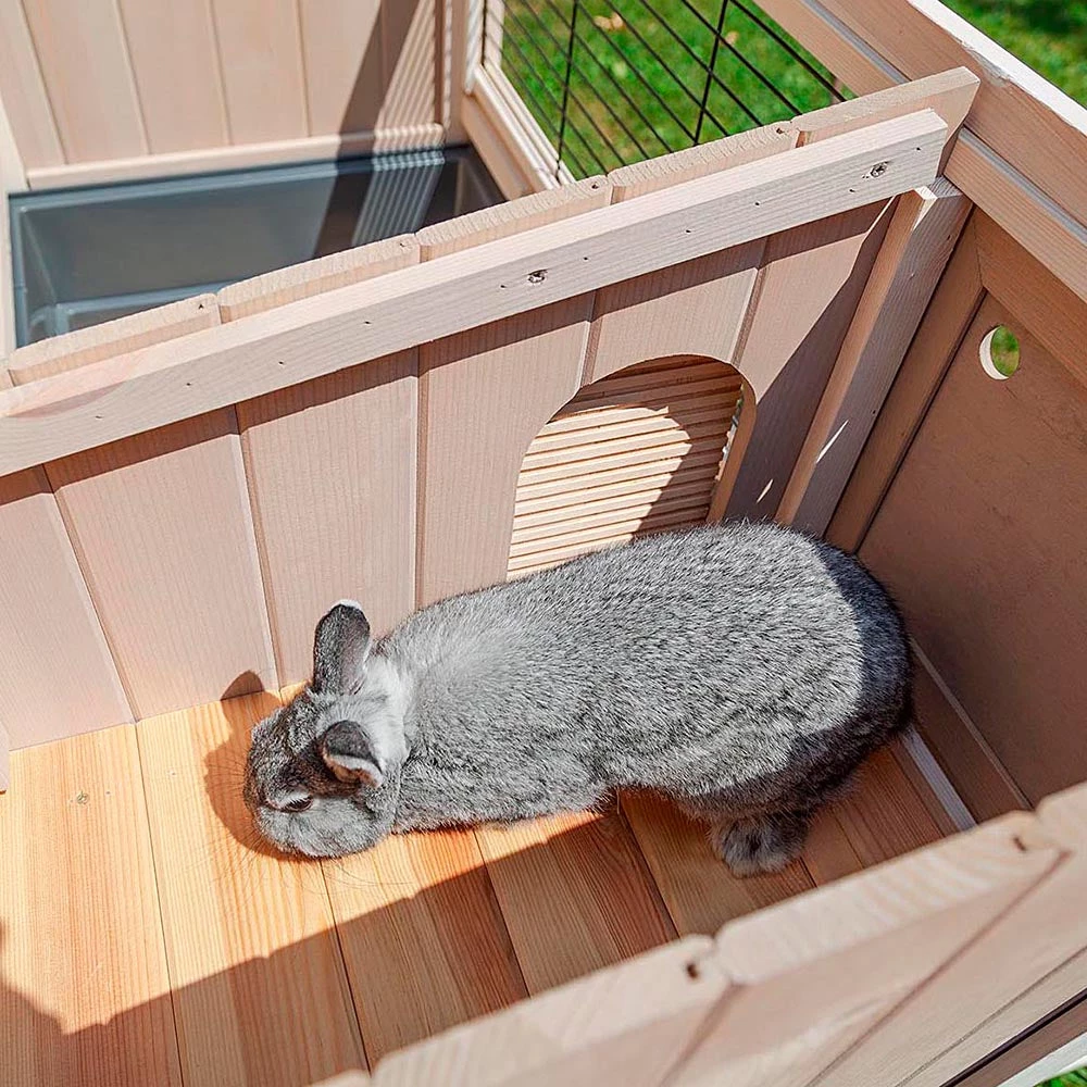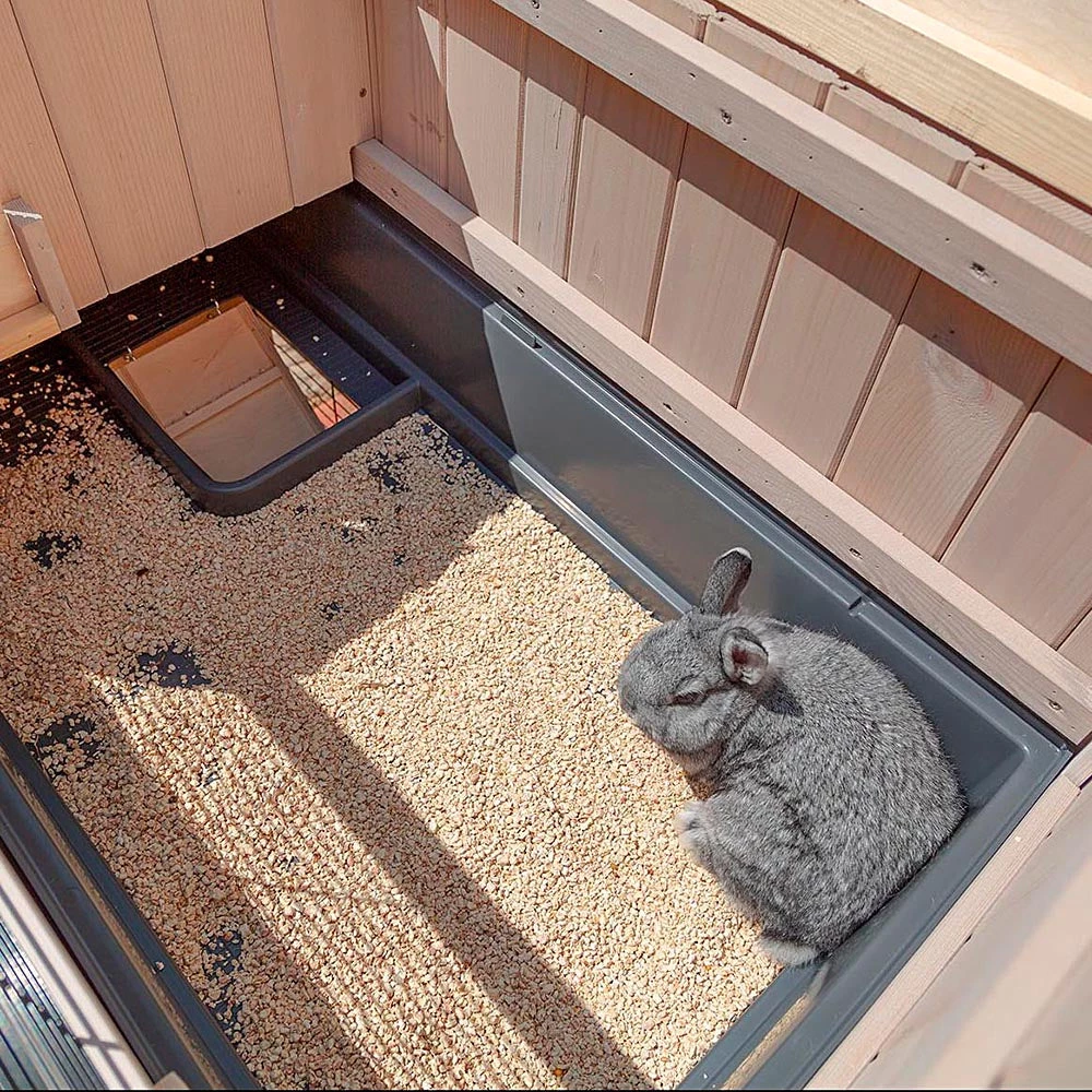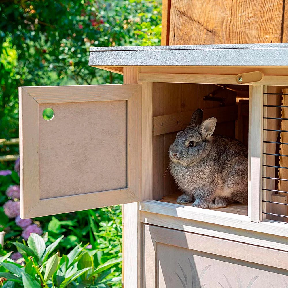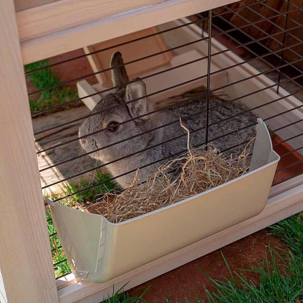 Der Kaninchenstall ist mit einer großen herausnehmbaren Schublade ausgestattet, die perfekt Schmutz, Speisereste oder Unrat auffängt. Sie wird von einer Holzklappe verdeckt, die wiederum mit speziellen Haken gesichert ist. Das vollständig zu öffnende Dach kann Dank der Stütze fixiert werden und ermöglicht den Zugang zur oberen Etage. Zu Reinigungszwecken kann die Öffnung zur unteren Ebene dank des mitgelieferten Verschlussdeckel versperrt werden.